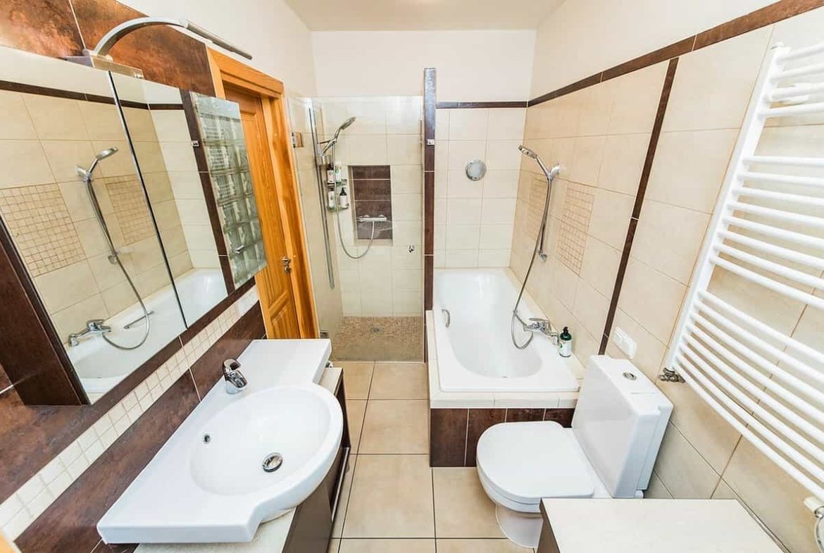 • Bendra patalpa su vonios kambariu, WC, dušo kabina ir skalbykla