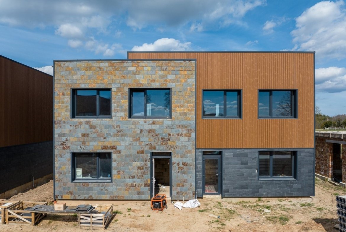 Sienos – keraminiai blokeliai, fasadas ventiliuojamas, apdailintas skalūnu ir deginta mediena.