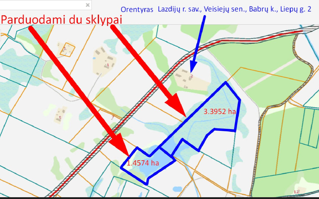 Parduodamas išskirtinis 4,8526 ha žemės plotas su dideliu, natūraliai susidariusiu ir įžuvintu vandens telkiniu. Sklypą sudaro du besiribojantys žemės plotai: vienas – 3,3952 ha, kitas – 1,4574 ha.