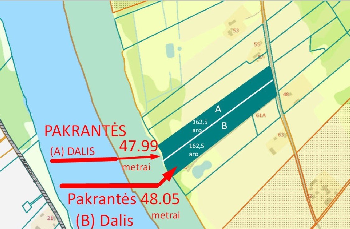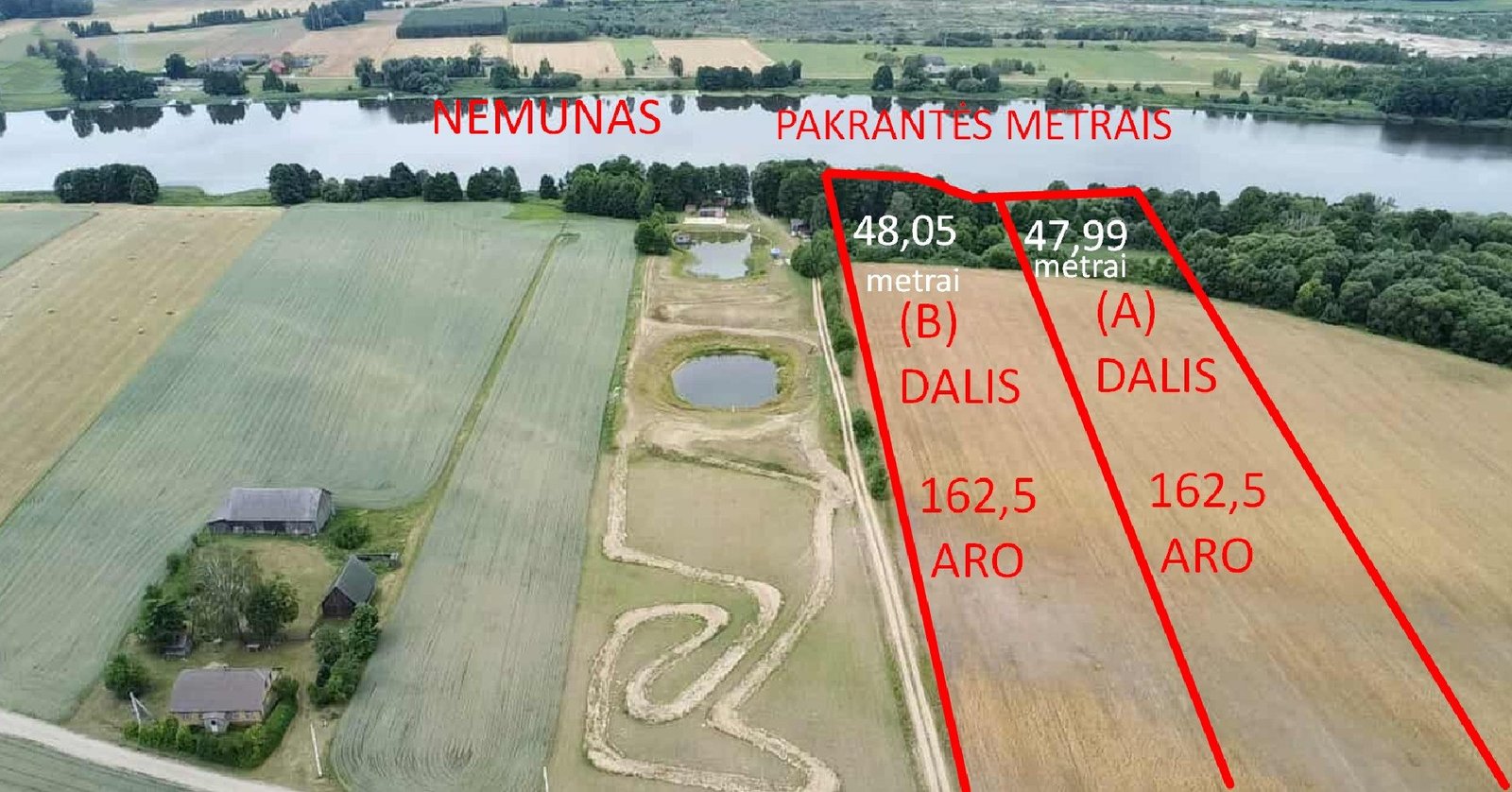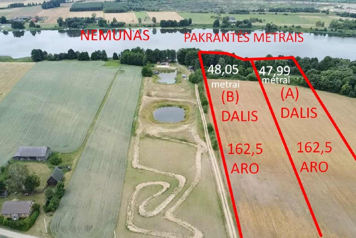 Pagal naudojimosi tvarką sklypas padalintas į dvi dalis – A ir B, po 162,5 aro. Abi dalys turi po ~50 metrų vaizdingos Nemuno pakrantės, atsiveriančios į plačius vandens horizontus.